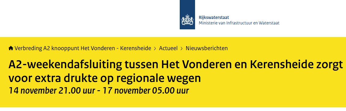 Eerste weekendafsluiting van de A2! Van vrijdag 14 november 21.00 uur tot maandag 17 november 05.00 uur...