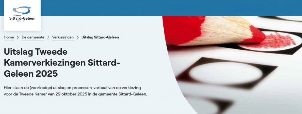 Niet gecategoriseerd Uitslag Tweede Kamerverkiezingen Sittard-Geleen 2025 Robert Rennenberg 31 oktober 2025 Klik op de link: https://sittard-geleen.nl/de-gemeente/verkiezingen/uitslag-sittard-geleen/ Lees verder Vorige: Kerstmarkt ’t Tuurhoes 13 december Gerelateerde verhalen Vrijdag 3 oktober | Broen Cafe Aovend in ’t Tuurhoes Niet gecategoriseerd Vrijdag 3 oktober | Broen Cafe Aovend in ’t Tuurhoes 27 september 2025 Göttekaovese Maestro! Niet gecategoriseerd Göttekaovese Maestro! 4 september 2025 Glow In The Dark Party | J.V. ’t Waeske Niet gecategoriseerd Glow In The Dark Party | J.V. ’t Waeske 22 augustus 2025