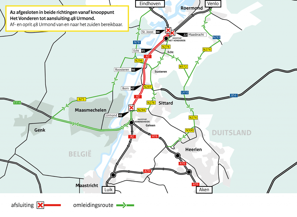 Eerste weekendafsluiting van de A2! Van vrijdag 14 november 21.00 uur tot maandag 17 november 05.00 uur is de A2 tussen Het Vonderen en Kerensheide in beide richtingen dicht.